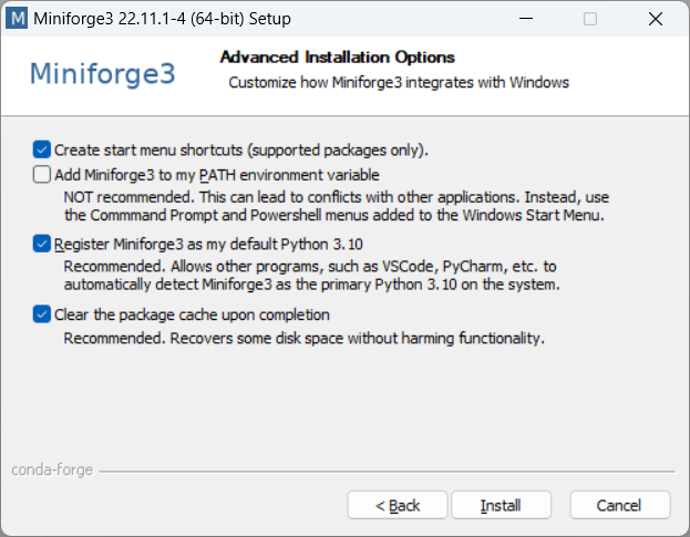 Registering the Conda distribution as the default Python 3.10 interpreter is optional. Preferably uncheck that box if you already have Python 3 installed on your system.